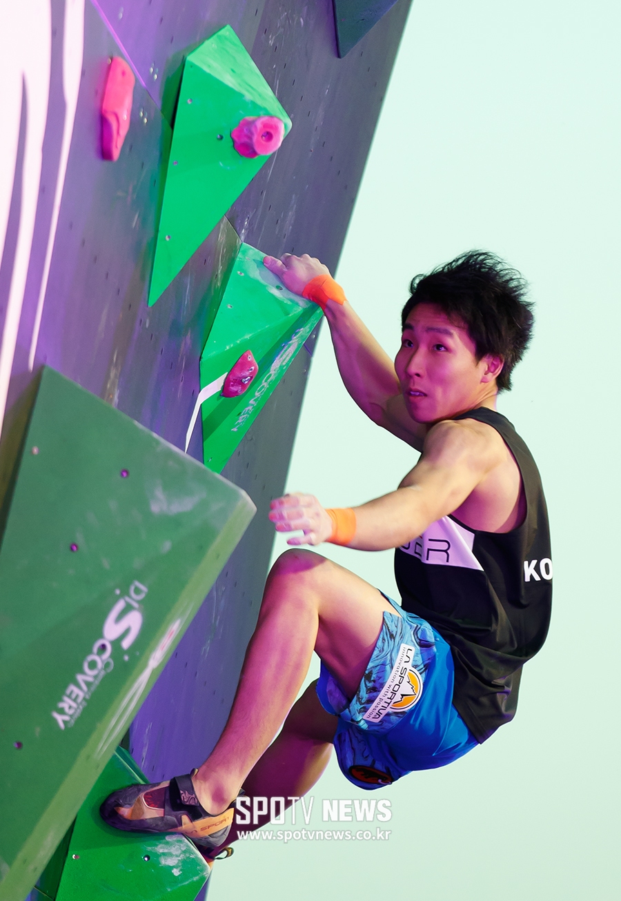 [스포티비뉴스=반포동, 한희재 기자] 스파이더 한강 클라이밍 챔피언십이 4일 오후 서울 서초구 반포동 예빛섬에서 열렸다. 일본 고레나가 게이치로가 프랑스 고티엘 서퍼와 8강전 대결을 펼치고 있다.