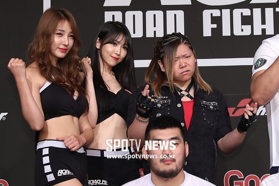 [스포티비뉴스=홍은동, 곽혜미 기자] XIAOMI 로드 FC 039 계체량이 9일 오후 서울 서대문구 홍은동 그랜드힐튼호텔에서 열렸다. 로드걸 임지우, 이은혜, 일본 요시코(왼쪽부터)가 포즈를 취하고 있다.