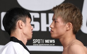 [스포티비뉴스=홍은동, 곽혜미 기자] XIAOMI 로드 FC 039 계체량이 9일 오후 서울 서대문구 홍은동 그랜드힐튼호텔에서 열렸다. 계체량을 통과한 문제훈(왼쪽)과 아사쿠라 가이가 기싸움을 하고 있다.