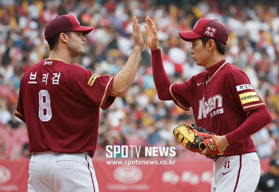 [스포티비뉴스=광주, 한희재 기자] KIA 타이거즈와 넥센 히어로즈의 2017 KBO 리그 경기가 10일 오후 광주-KIA챔피언스필드에서 열렸다. 1회말 2사 1, 2루, 넥센 선발투수 브리검이 KIA 안치홍의 타구를 잡아낸 우익수 이정후와 하이파이브를 나누고 있다.