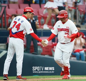 [스포티비뉴스=광주, 한희재 기자] KIA 타이거즈와 넥센 히어로즈의 2017 KBO 리그 경기가 10일 오후 광주-KIA챔피언스필드에서 열렸다. 2회말 1사, KIA 이범호가 넥센 브리검을 상대로 솔로포를 날린 후 김종국 코치와 하이파이브를 나누고 있다.