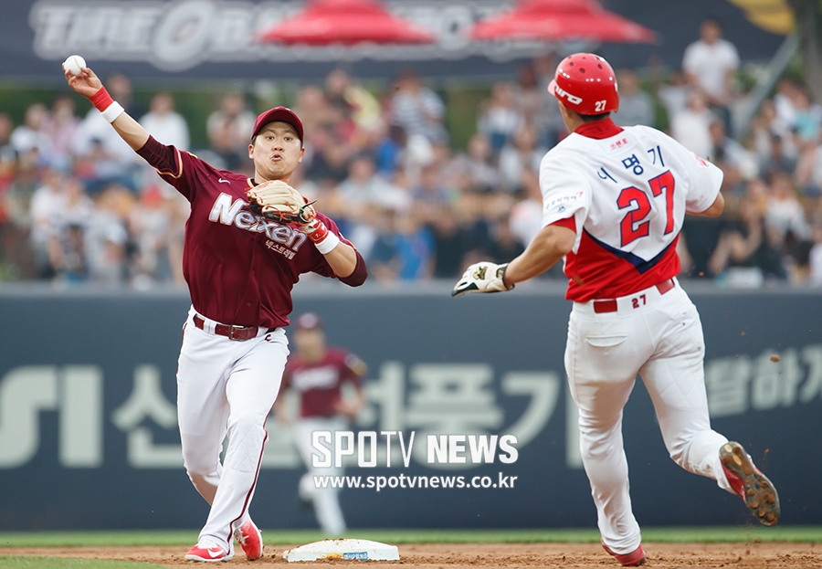 [스포티비뉴스=광주, 한희재 기자] KIA 타이거즈와 넥센 히어로즈의 2017 KBO 리그 경기가 10일 오후 광주-KIA챔피언스필드에서 열렸다. 5회말 1사 1루, KIA 김주찬의 유격수 땅볼을 넥센 2루수 김지수가 병살로 연결하고 있다.