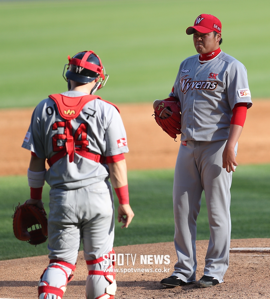 [스포티비뉴스=잠실, 곽혜미 기자] 11일 오후 서울 잠실야구장에서 열린 2017 KBO 리그 LG 트윈스와 SK 와이번스의 경기. 2회말 2사 만루 상황에서 LG 양석환에게 3타점 3루타를 허용한 SK 선발 김태훈이 강판 되고 있다.