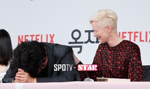 [스포티비뉴스=한희재 기자] 영화 옥자의 기자회견이 14일 오전 서울 종로구 당주동 포시즌스호텔에서 열렸다. 배우 틸다 스윈튼이 변희봉의 농담에 장난스레 좌절하는 봉준호 감독을 위로하고 있다.