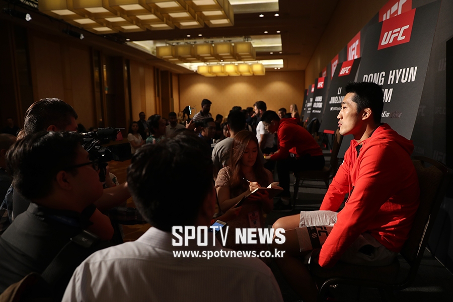 [스포티비뉴스=싱가포르, 곽혜미 기자] UFC 파이트 나이트 111(UFC in 싱가포르) 미디어 데이가 15일 오후 싱가포르 마리나 베이 샌즈 호텔에서 열렸다. 웰터급 김동현이 인터뷰를 하고 있다.