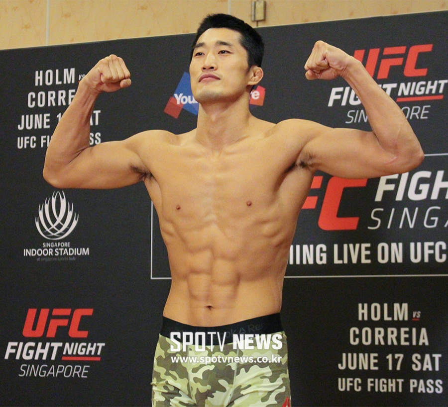 [스포티비뉴스=싱가포르, 곽혜미 기자] 16일 오전 싱가포르 마리나 베이 샌즈 컨벤션 센터에서 열린 UFC 파이트 나이트 111(UFC in 싱가포르) 실제 계체량, 김동현이 계체를 통과한 후 포즈를 취하고 있다. 16일(오늘) 저녁 8시부터 진행되는 UFC 파이트 나이트 111 공개 계체는 온라인 스트리밍 서비스 SPOTV NOW(spotvnow.co.kr)에서 생중계된다.