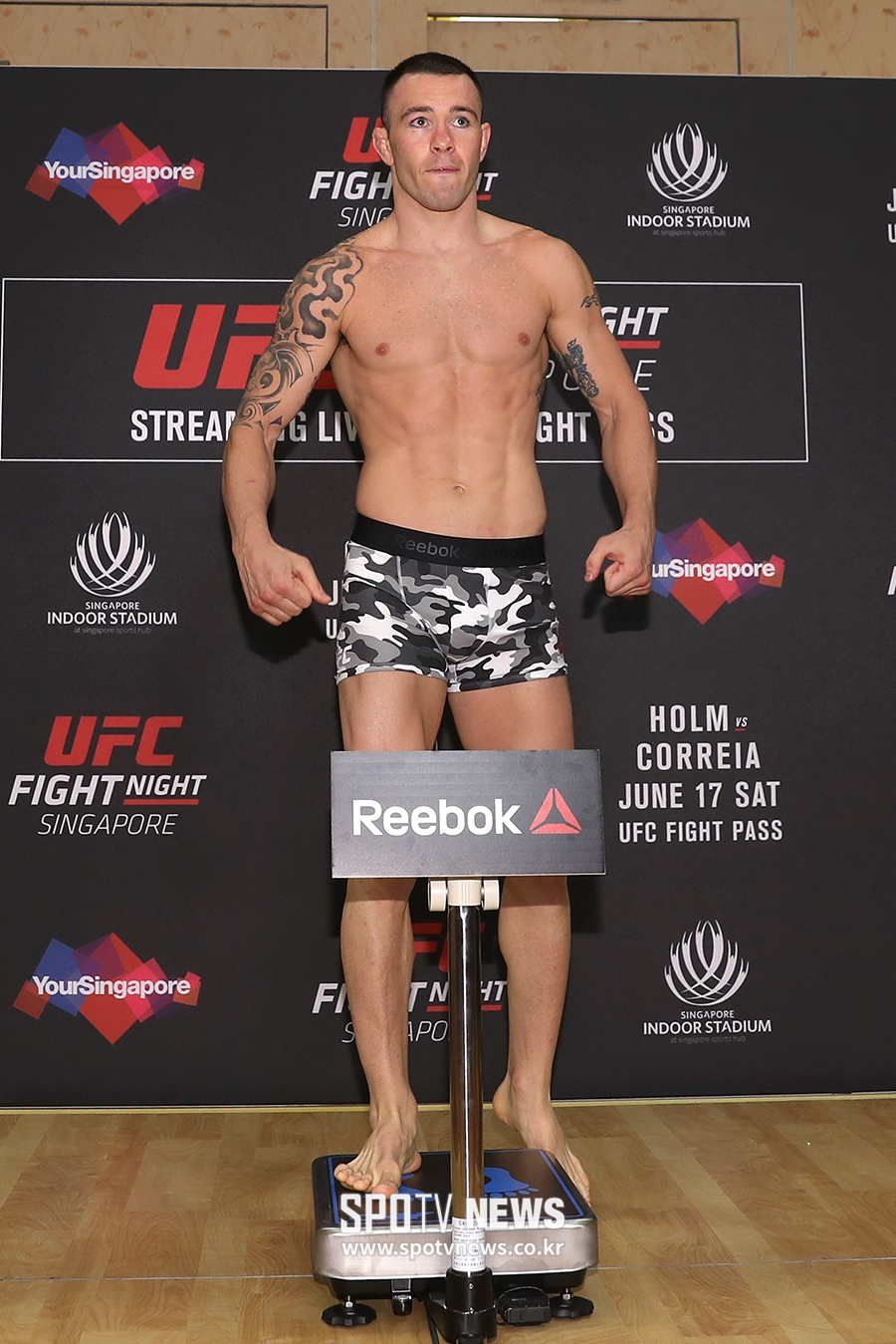 [스포티비뉴스=싱가포르, 곽혜미 기자] 16일 오전 싱가포르 마리나 베이 샌즈 컨벤션 센터에서 열린 UFC 파이트 나이트 111(UFC in 싱가포르) 실제 계체량, 김동현 상대인 콜비 코빙턴이 계체를 통과한 후 포즈를 취하고 있다. 16일(오늘) 저녁 8시부터 진행되는 UFC 파이트 나이트 111 공개 계체는 온라인 스트리밍 서비스 SPOTV NOW(spotvnow.co.kr)에서 생중계된다.