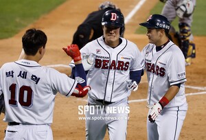 [스포티비뉴스=잠실, 한희재 기자] 두산 베어스와 NC 다이노스의 2017 KBO 리그 경기가 16일 오후 서울 잠실야구장에서 열렸다. 4회말 1사 1루, NC 이재학을 상대로 왼쪽 투런 홈런을 날린 두산 민병헌이 하이파이브를 나누고 있다.