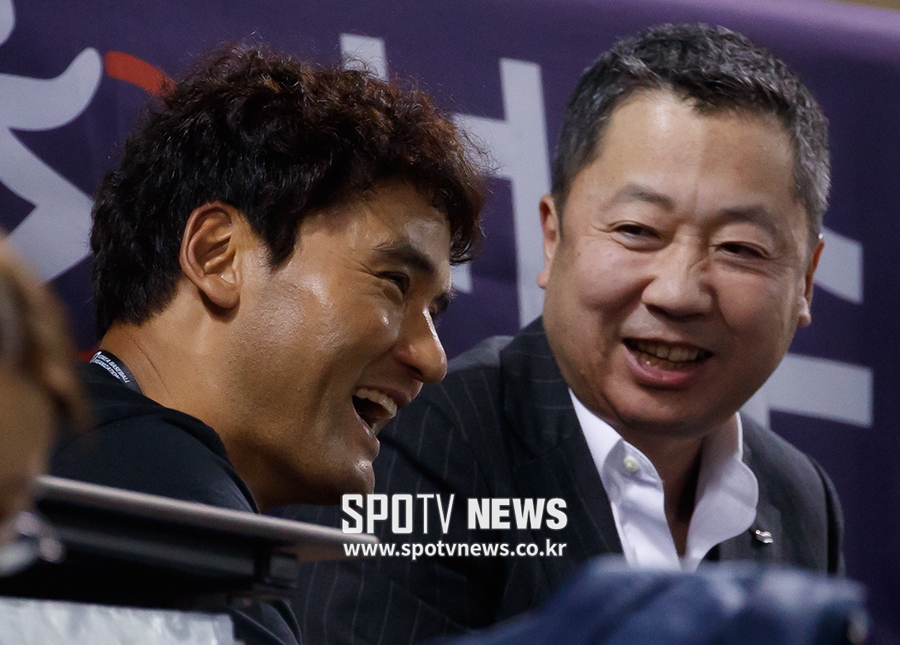 [스포티비뉴스=잠실, 한희재 기자] 두산 베어스와 NC 다이노스의 2017 KBO 리그 경기가 16일 오후 서울 잠실야구장에서 열렸다. 야구장을 찾은 박찬호가 두산 박정원 회장과 이야기를 나누고 있다.