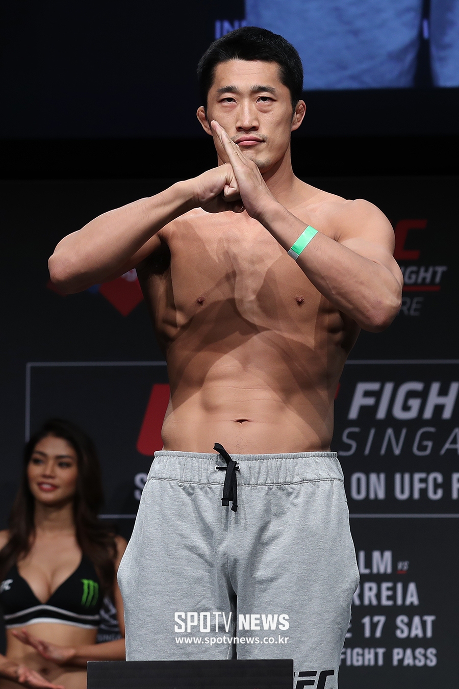 [스포티비뉴스=싱가포르, 곽혜미 기자] 16일 오후 싱가포르 마리나 베이 샌즈 컨벤션 센터에서 열린 UFC 파이트 나이트 111(UFC in 싱가포르) 공개 계체, 계체를 통과한 김동현이 포즈를 취하고 있다.