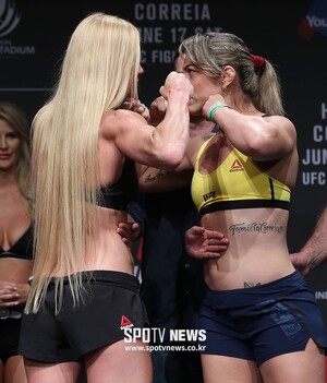 [스포티비뉴스=싱가포르, 곽혜미 기자] 16일 오후 싱가포르 마리나 베이 샌즈 컨벤션 센터에서 열린 UFC 파이트 나이트 111(UFC in 싱가포르) 공개 계체, 계체를 통과한 홀리 홈(왼쪽)과 베치 코헤이아가 기싸움을 하고 있다.