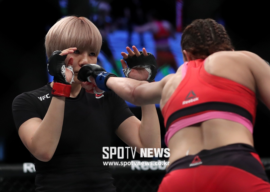 [스포티비뉴스=싱가포르, 곽혜미 기자] 17일 오후 싱가포르 인도어 스타디움에서 열린 UFC 파이트 나이트 111(UFC in 싱가포르), 김지연이 체코 루시 푸딜로바와 경기를 펼치고 있다.
