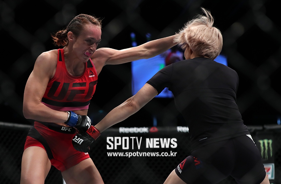 [스포티비뉴스=싱가포르, 곽혜미 기자] 17일 오후 싱가포르 인도어 스타디움에서 열린 UFC 파이트 나이트 111(UFC in 싱가포르), 김지연이 체코 루시 푸딜로바의 펀치에 맞고 있다.
