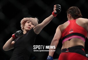 [스포티비뉴스=싱가포르, 곽혜미 기자] 17일 오후 싱가포르 인도어 스타디움에서 열린 UFC 파이트 나이트 111(UFC in 싱가포르), 김지연이 체코 루시 푸딜로바를 향해 펀치를 날리고 있다.