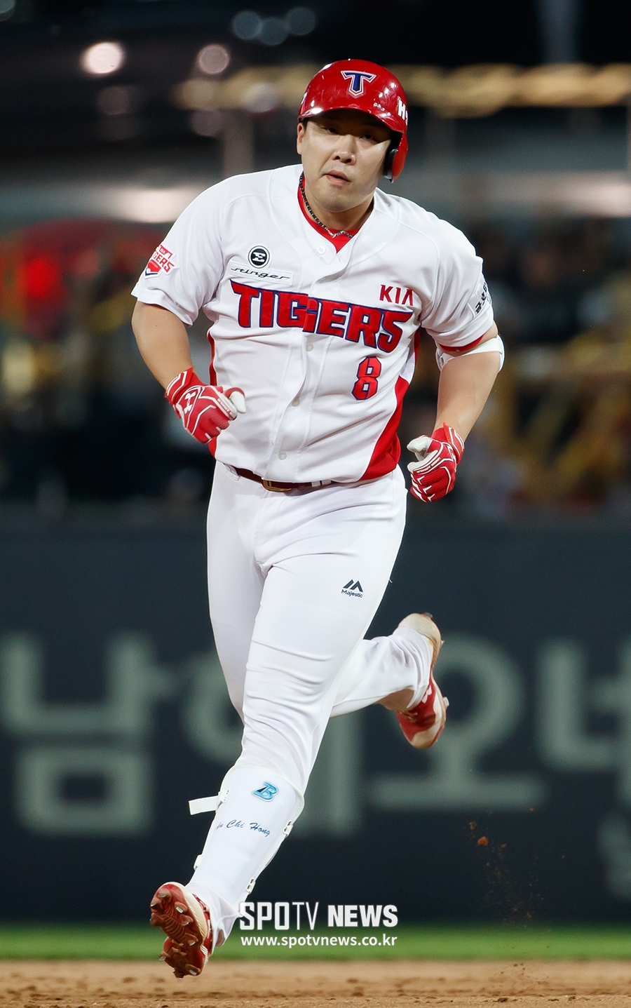 ▲ 안치홍 ⓒ 한희재 기자[스포티비뉴스=광주, 박성윤 기자 KIA 타이거즈 안치홍이 17일 광주기아챔피언스필드에서 열리고 있는 2017 타이어뱅크 KBO 리그 LG 트윈스와 경기에서 좌월 솔로포로 터뜨렸다.안치홍은 3-3 동점인 6회말 1사 주자 없을 때 타석에 들어서 LG 외국인 선발투수 헨리 소사를 상대로 볼카운트 1-2에서 시속 154km 높은 포심 패스트볼을 공략해 팀에 리드를 안기는 좌월 1점 아치를 그렸다. 안치홍 시즌 8호 홈런이다.안치홍 홈런으로 경기는 6회말 현재 KIA가 4-3으로 경기를 리드하고 있다.