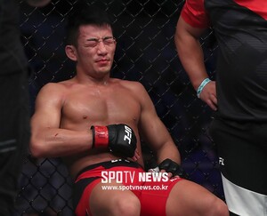 [스포티비뉴스=싱가포르, 곽혜미 기자] 17일 오후 싱가포르 인도어 스타디움에서 열린 UFC 파이트 나이트 111(UFC in 싱가포르), 곽관호가 러셀 돈에게 KO패 당한 후 아쉬워하고 있다.