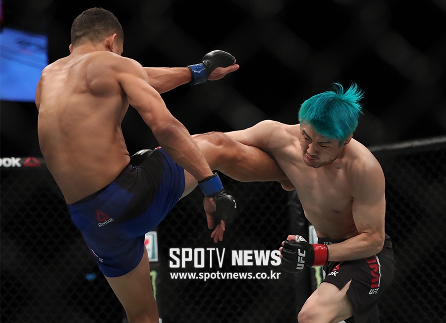 [스포티비뉴스=싱가포르, 곽혜미 기자] 17일 오후 싱가포르 인도어 스타디움에서 열린 UFC 파이트 나이트 111(UFC in 싱가포르), 일본 고미 다카노리가 미국 존 턱에게 펀치를 날리다 킥에 맞고 있다.