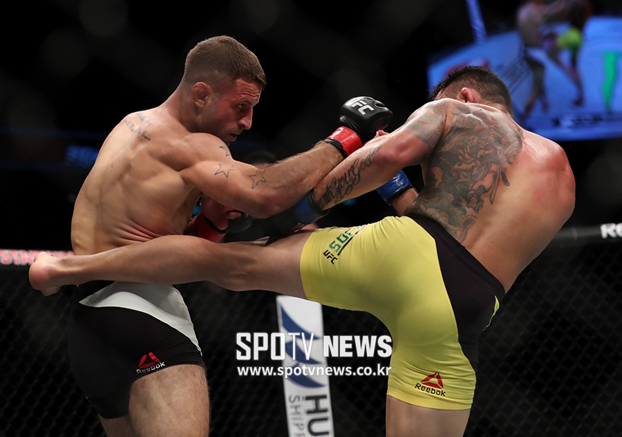 [스포티비뉴스=싱가포르, 곽혜미 기자] 17일 오후 싱가포르 인도어 스타디움에서 열린 UFC 파이트 나이트 111(UFC in 싱가포르), 하파엘 도스 안요스와 타렉 사피딘이 공격을 주고받고 있다.