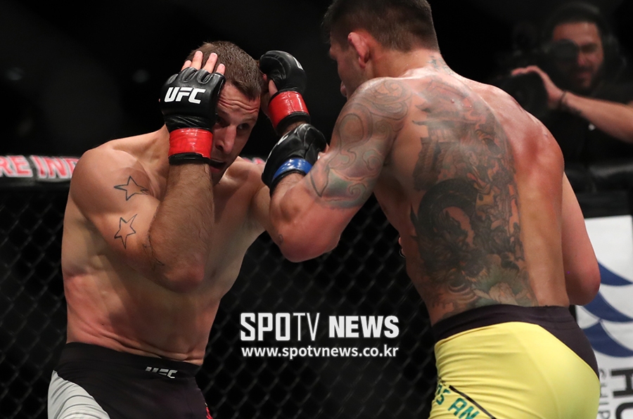 [스포티비뉴스=싱가포르, 곽혜미 기자] 17일 오후 싱가포르 인도어 스타디움에서 열린 UFC 파이트 나이트 111(UFC in 싱가포르), 하파엘 도스 안요스와 대결을 펼치는 타렉 사피딘이 빈틈을 살피고 있다.