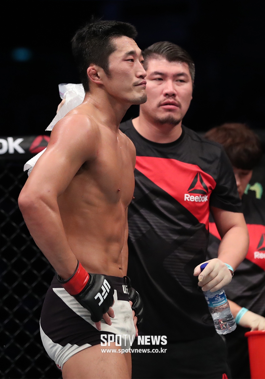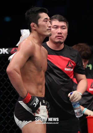 [스포티비뉴스=싱가포르, 곽혜미 기자] 17일 오후 싱가포르 인도어 스타디움에서 열린 UFC 파이트 나이트 111(UFC in 싱가포르), 김동현이 미국 콜비 코빙턴과의 대결을 마친 후 판정을 기다리고 있다.