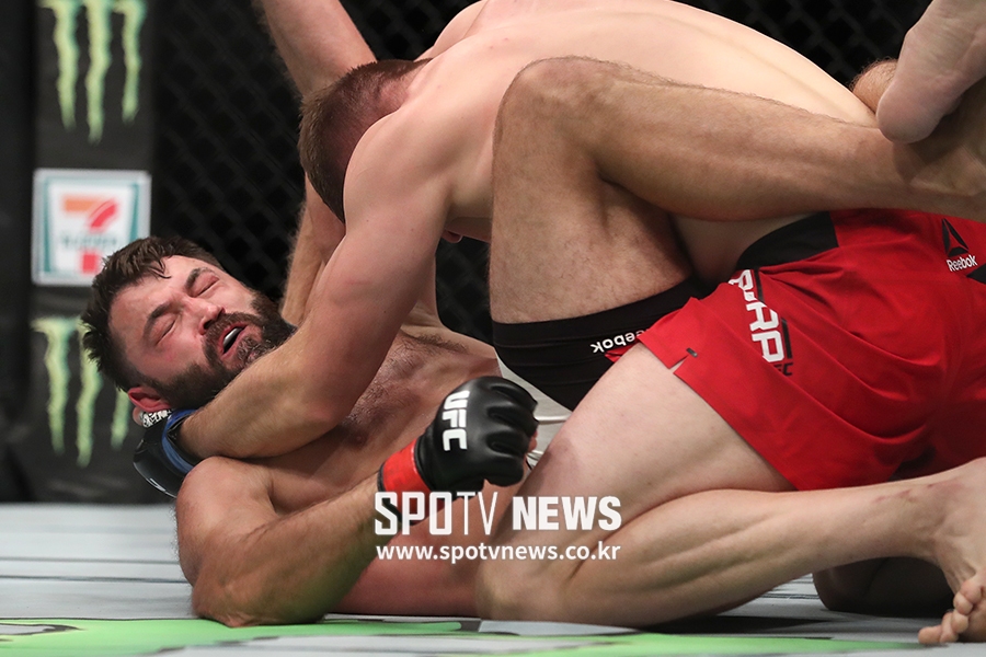 [스포티비뉴스=싱가포르, 곽혜미 기자] 17일 오후 싱가포르 인도어 스타디움에서 열린 UFC 파이트 나이트 111(UFC in 싱가포르), 알롭스키가 티부라의 공격에 힘겨워하고 있다.