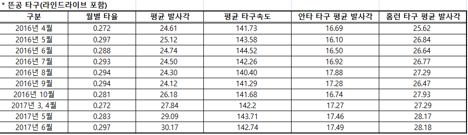 확실히 전체적인 팀 타율도 오르고 있다. 전체 타율 2할7푼2리로 시작된 2017시즌은 5월들어 2할8푼3리로 타율이 올랐고 6월에는 2할9푼7리를 기록중이다. 이미 타고투저가 극에 달했던 지난 해 페이스를 되찾고 있다.