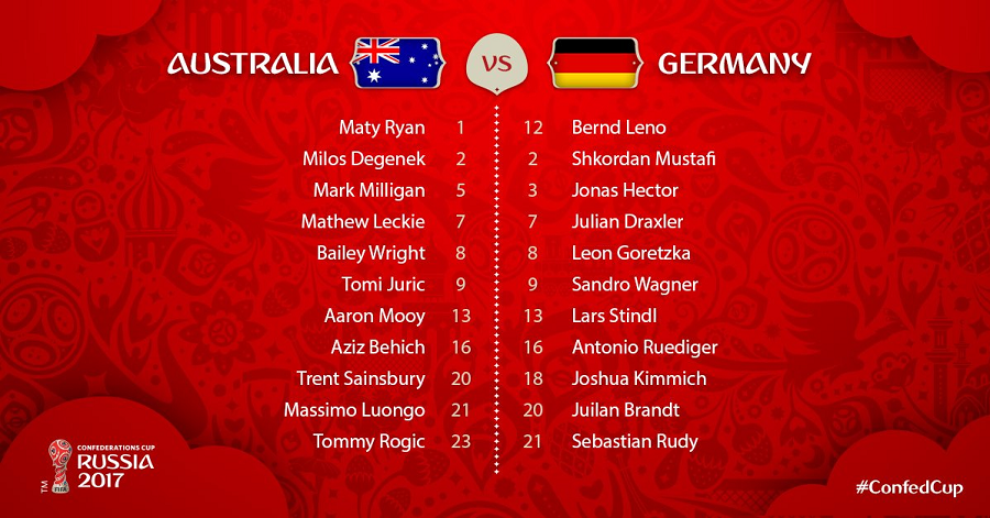 독일은 20일(이하 한국 시간) 러시아 소치의 피스트 스타디움에서 열리는 FIFA 컨페더레이션스컵 러시아 2017 조별리그 B조 1차전 호주와 경기에 나설 선발 라인업을 발표했다.