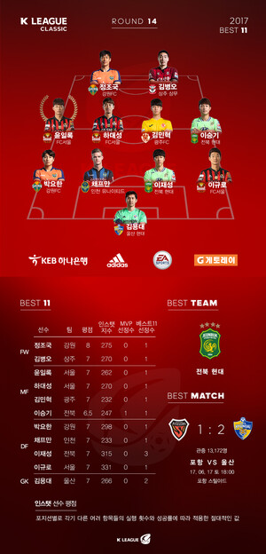 14라운드 베스트 11에는 공격수 정조국(강원), 김병오(상주), 미드필더 윤일록, 하대성(서울), 김민혁(광주), 이승기(전북), 수비수 박요한(강원), 채프만(인천), 이재성(전북), 이규로(서울), 골키퍼 김용대(울산)가 뽑혔다.
