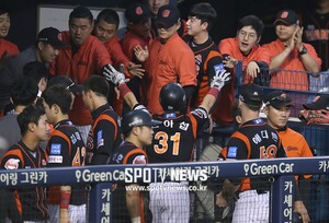 [스포티비뉴스=잠실, 곽혜미 기자] 24일 오후 서울 잠실야구장에서 열린 2017 KBO 리그 두산 베어스와 롯데 자이언츠의 경기, 8회초 무사 1,2루 상황 롯데 전준우의 1타점 적시타 때 홈을 밟은 2루 주자 손아섭이 선수들과 기쁨을 나누고 있다.
