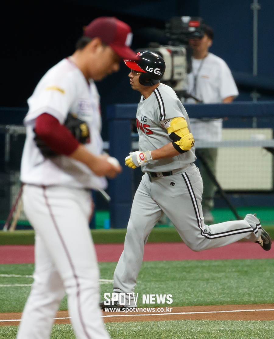 [스포티비뉴스=고척돔, 한희재 기자] 넥센 히어로즈와 LG 트윈스의 2017 KBO리그가 25일 오후 서울 구로구 고척스카이돔에서 열렸다. 2회초 무사 넥센 윤영삼을 상대로 왼쪽 솔로 홈런을 날린 LG 정성훈이 베이스를 돌고 있다.