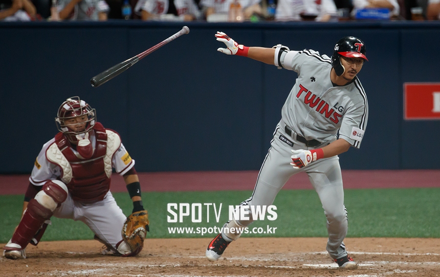 [스포티비뉴스=고척돔, 한희재 기자] 넥센 히어로즈와 LG 트윈스의 2017 KBO리그가 25일 오후 서울 구로구 고척스카이돔에서 열렸다. 5회초 2사 1루, LG 박용택이 8구 승부끝에 안타를 날리고 있다.