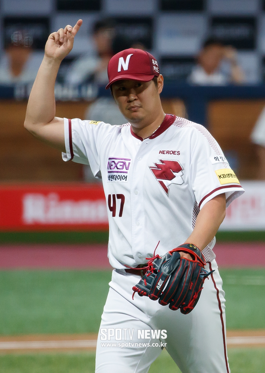 [스포티비뉴스=고척돔, 한희재 기자] 넥센 히어로즈와 LG 트윈스의 2017 KBO리그가 25일 오후 서울 구로구 고척스카이돔에서 열렸다. 6회초 2사 1루, LG 유강남을 내야 플라이로 잡아낸 넥센 투수 이보근이 공을 가리키고 있다.
