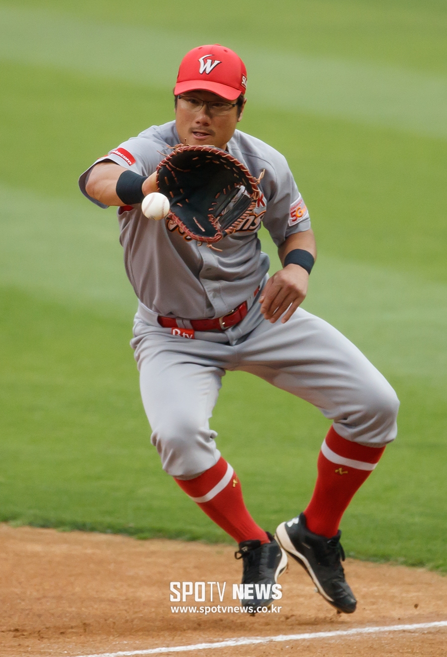 [스포티비뉴스=잠실, 한희재 기자] 두산 베어스와 SK 와이번스의 2017 KBO 리그 경기가 27일 오후 서울 잠실야구장에서 열렸다. 2회말 2사 만루, SK 1루수 박정권이 두산 정진호의 땅볼을 잡고 있다.