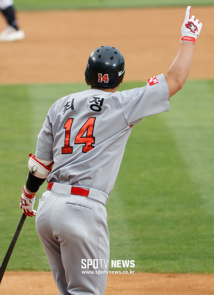 [스포티비뉴스=잠실, 한희재 기자] 두산 베어스와 SK 와이번스의 2017 KBO 리그 경기가 27일 오후 서울 잠실야구장에서 열렸다. 3회초 2사 1, 3루, 두산 선발투수 니퍼트를 상대로 왼쪽 스리런 홈런을 날린 SK 최정이 손을 번쩍 들고 있다.
