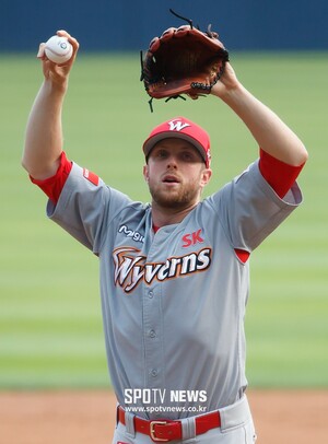 [스포티비뉴스=잠실, 한희재 기자] 두산 베어스와 SK 와이번스의 2017 KBO 리그 경기가 28일 오후 서울 잠실야구장에서 열렸다. 1회말 선발 마운드에 오른 SK 투수 켈리가 심호흡을 하고 있다.