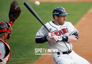 [스포티비뉴스=잠실, 한희재 기자] 두산 베어스와 SK 와이번스의 2017 KBO 리그 경기가 28일 오후 서울 잠실야구장에서 열렸다. 1회말 1사 1루, 두산 에반스가 SK 켈리의 몸쪽 공에 놀라고 있다.