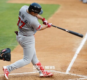 [스포티비뉴스=잠실, 한희재 기자] 두산 베어스와 SK 와이번스의 2017 KBO 리그 경기가 28일 오후 서울 잠실야구장에서 열렸다. 4회초 무사 1, 3루, SK 정의윤이 1타점 선제 적시타를 날리고 있다.