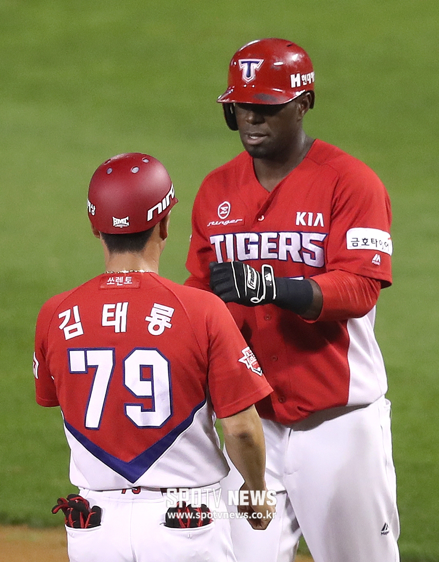 [스포티비뉴스=잠실, 곽혜미 기자] 1일 오후 서울 잠실야구장에서 열린 2017 KBO 리그 LG 트윈스와 KIA 타이거즈의 경기. 7회초 2사 2,3루 상황에서 1타점 적시타를 친 KIA 버나디나가 코치와 기쁨을 나누고 있다.