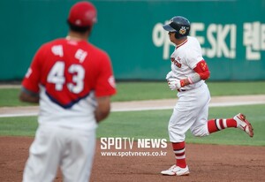 [스포티비뉴스=인천, 한희재 기자] SK 와이번스와 KIA 타이거즈의 2017 KBO 리그 경기가 4일 오후 SK 행복드림구장에서 열렸다. 1회말 1사, KIA 헥터를 상대로 솔로포를 날린 SK 나주환이 베이스를 돌고 있다.