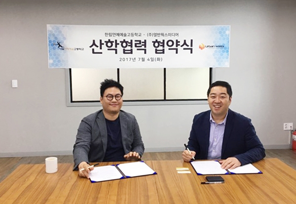 얼반웍스미디어 허건 대표이사와 한림연예예술고등학교 교장권한위임 이상준 기획조정실장은 지난 4일 만나 엔터테인먼트 산업변화에 능동적으로 대처하고, 상호 긴밀한 교류와 협력을 통해 산업 발전에 필요한 전문 인력 양성 등 상호 공동 발전을 위한 산한협력 협약을 체결했다.