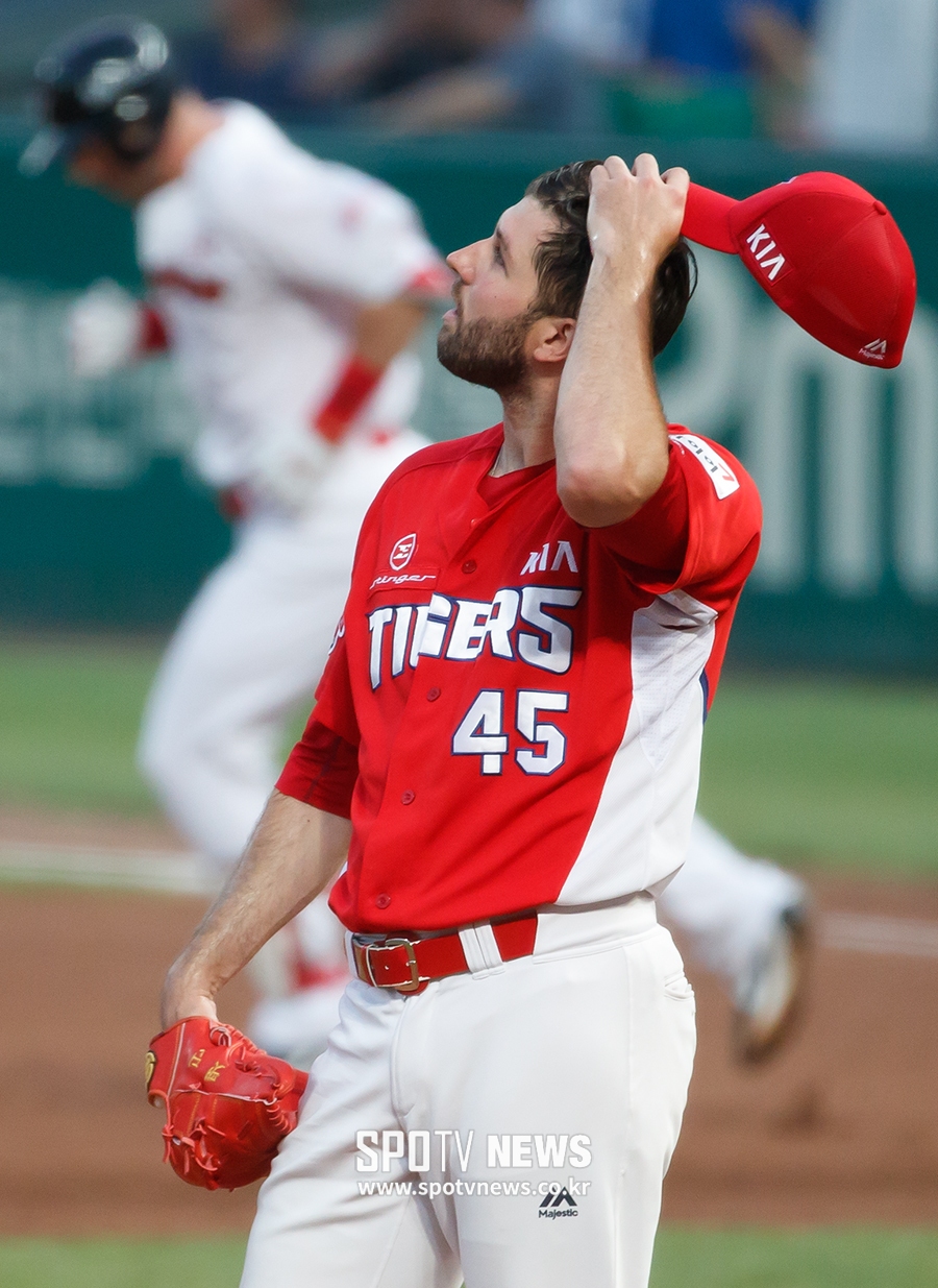 [스포티비뉴스=인천, 한희재 기자] SK 와이번스와 KIA 타이거즈의 2017 KBO 리그 경기가 5일 오후 인천 SK 행복드림구장에서 열렸다. 3회말 2사 1루, SK 로맥에게 투런포를 허용한 KIA 선발투수 팻 딘이 아쉬워하고 있다.