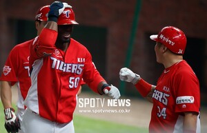 [스포티비뉴스=인천, 한희재 기자] SK 와이번스와 KIA 타이거즈의 2017 KBO 리그 경기가 5일 오후 인천 SK 행복드림구장에서 열렸다. 5회초 무사 1루, KIA 버나디나가 SK 투수 문광은을 상대로 투런 홈런을 날리며 8경기 연속 팀 두자릿수 득점을 기록했다. 대기타석의 최형우와 하이파이브 나누는 버나디나.