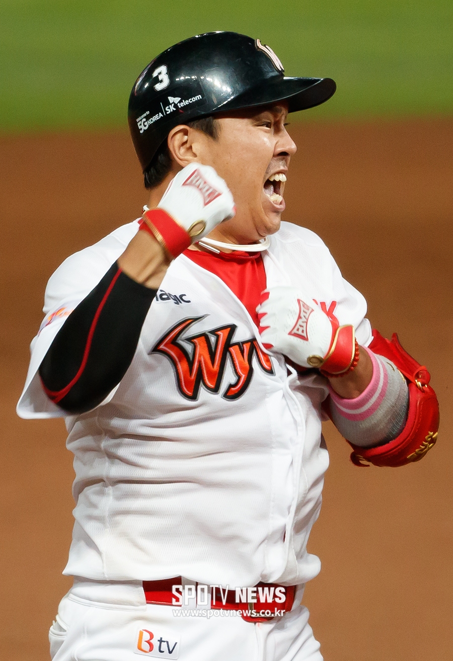 [스포티비뉴스=인천, 한희재 기자] SK 와이번스와 KIA 타이거즈의 2017 KBO 리그 경기가 5일 오후 인천 SK 행복드림구장에서 열렸다. 8회말 2사 만루, KIA 임창용을 상대로 역전 3루타를 날린 SK 나주환이 환호하고 있다.