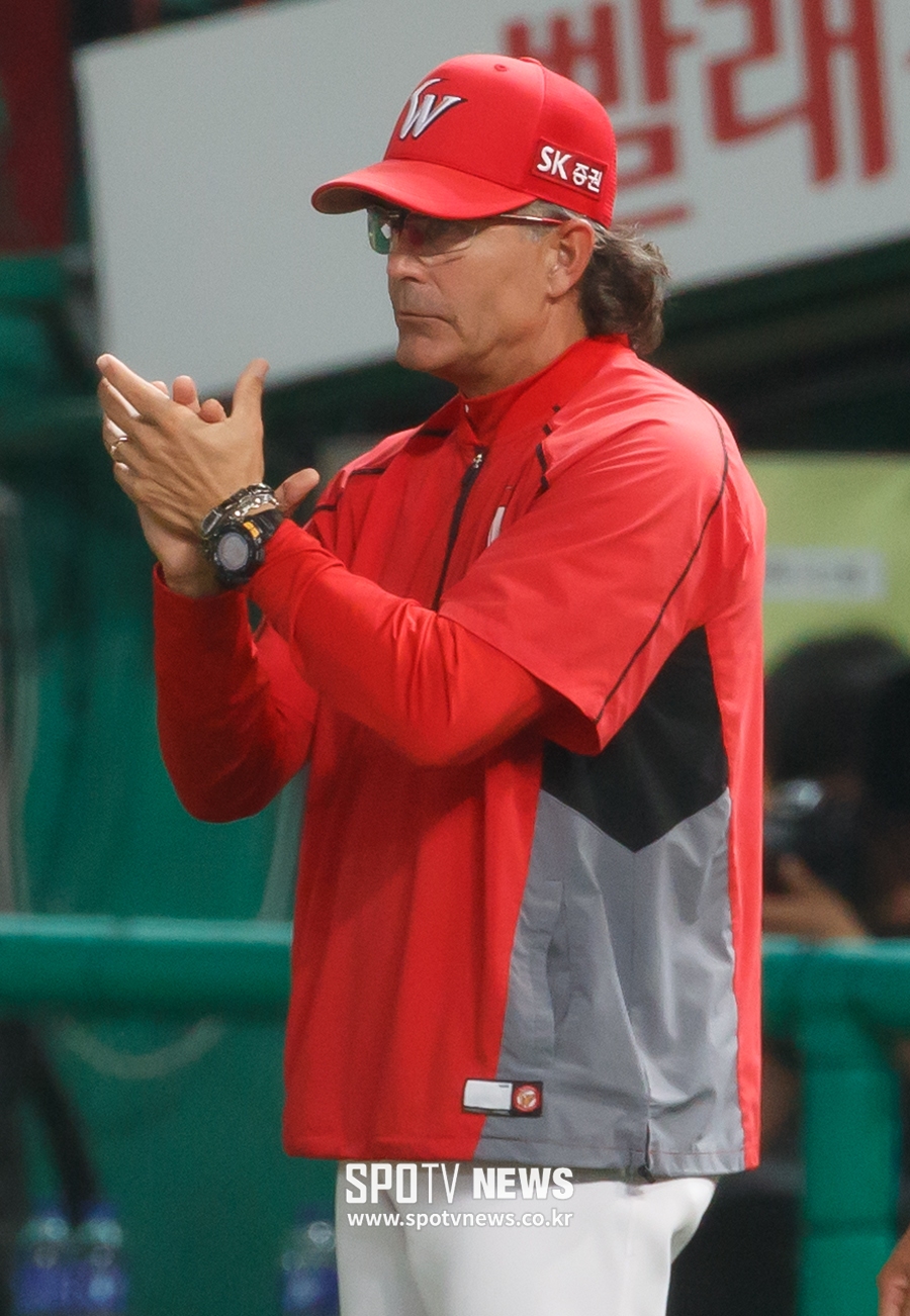 [스포티비뉴스=인천, 한희재 기자] SK 와이번스와 KIA 타이거즈의 2017 KBO 리그 경기가 5일 오후 인천 SK 행복드림구장에서 열렸다. 양팀은 홈런 10개를 주고 받는 난타전을 펼치며 SK가 18-17 역전승을 거뒀다. 승리를 거둔 SK 트레이 힐만 감독이 박수를 보내고 있다.