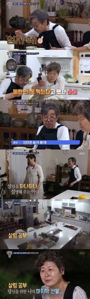 전영자 씨는 완성된 요리를 먹으며 "눈물 나도록 행복하다"고 고백했다. 이어 "앞으로도 해 달라. 아픈 게 다 나았다. 치통도 없다"며 웃었다. 또 "평생 글만 쓰던 사람이 주방에 와서 이렇게 일을 한다"며 기특해 했다. 그러면서 "혼자 있을 때가 없겠지만 사람 일은 모른다. 혼자 살아가는 법을 더 많이 가르쳐줄 것"이라며 지극한 남편 사랑을 드러냈다.