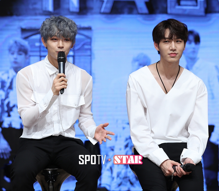 [스포티비뉴스=곽혜미 기자] 보이그룹 헤일로 세 번째 미니 앨범 발매 기념 쇼케이스가 6일 오후 서울 강남구 청담동 일지아트홀에서 열렸다. 헤일로 오운(왼쪽), 재용이 기자 간담 시간을 갖고 있다.