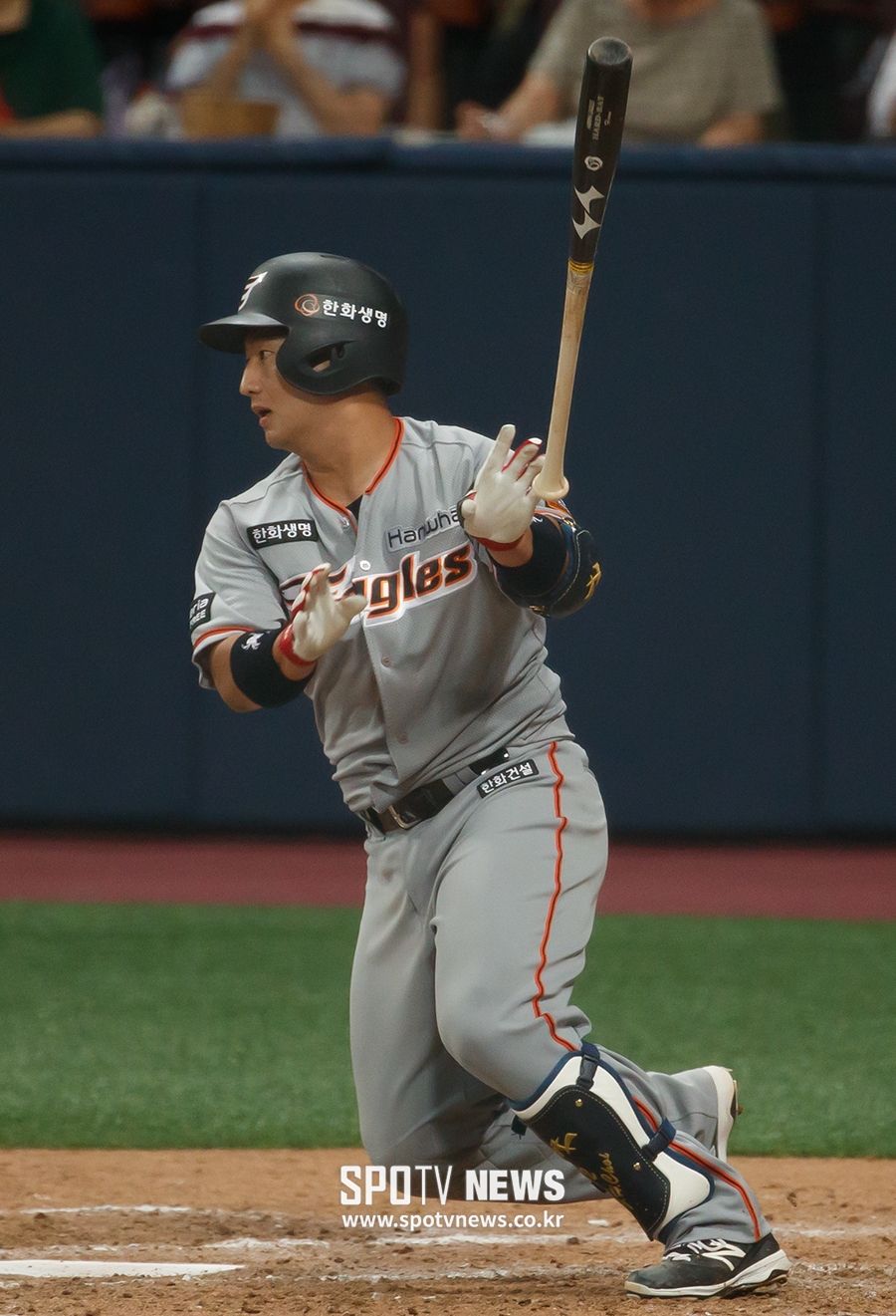 [스포티비뉴스=고척돔, 한희재 기자] 넥센 히어로즈와 한화 이글스의 2017 KBO리그가 6일 오후 서울 구로구 고척스카이돔에서 열렸다. 5회초 무사, 한화 최재훈이 안타를 날리고 있다.