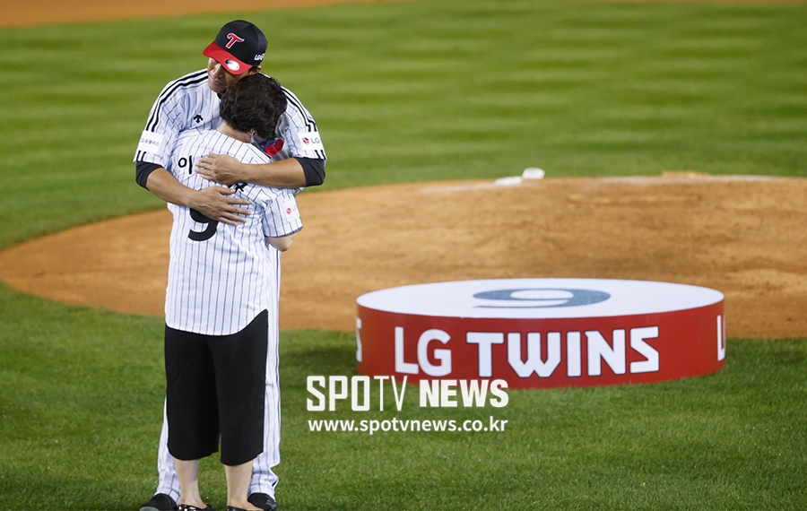[스포티비뉴스=잠실, 한희재 기자] 9일 오후 LG 트윈스와 한화 이글스의 2017 KBO 리그 경기가 종료 된 후 은퇴 한 LG 이병규의 영구결번식이 열렸다. 이병규가 깜짝 등장한 어머니와 눈물의 포옹을 나누고 있다.