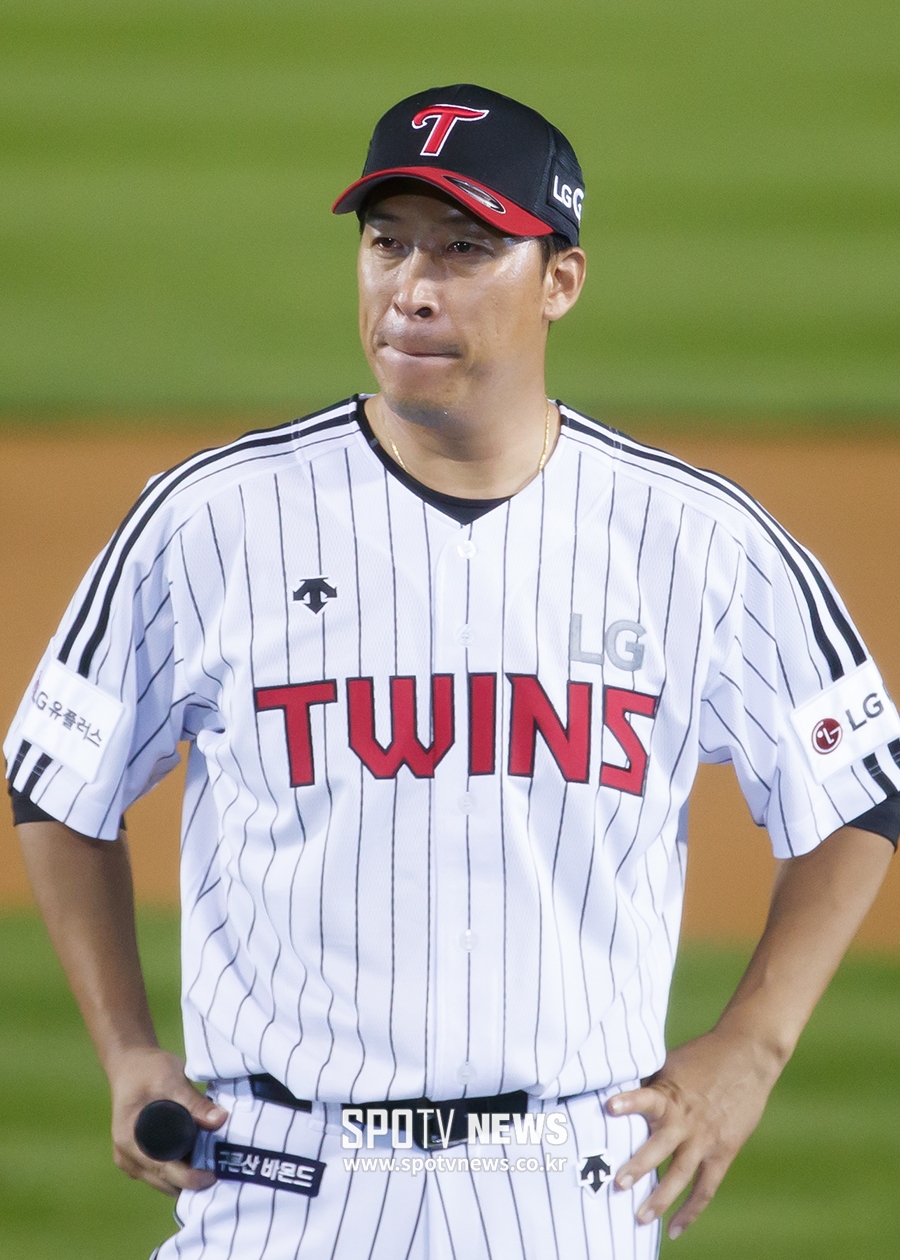 [스포티비뉴스=잠실, 한희재 기자] 9일 오후 LG 트윈스와 한화 이글스의 2017 KBO 리그 경기가 종료 된 후 은퇴 한 LG 이병규의 영구결번식이 열렸다. 이병규가 눈물을 삼키고 있다.