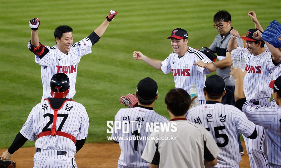 [스포티비뉴스=잠실, 한희재 기자] 9일 오후 LG 트윈스와 한화 이글스의 2017 KBO 리그 경기가 종료 된 후 은퇴 한 LG 이병규의 영구결번식이 열렸다. 이벤트로 열린 타석에 들어서 안타를 날린 이병규가 그라운드를 돌아 홈을 밟고 있다.